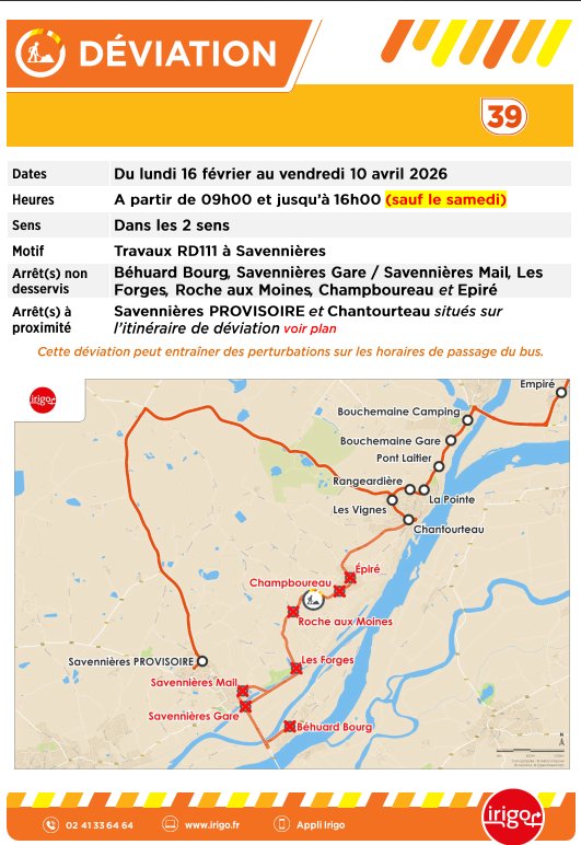 IRIGO - MODIFICATION DE L'ITINÉRAIRE DE LA LIGNE 39 DU 16.02.26 AU 10.04.26