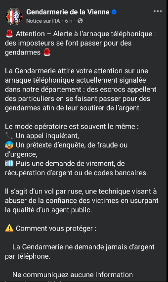 VIGILANCE : ATTENTION - Alerte à l'arnaque téléphonique - des imposteurs se font passer pour des gendarmes...