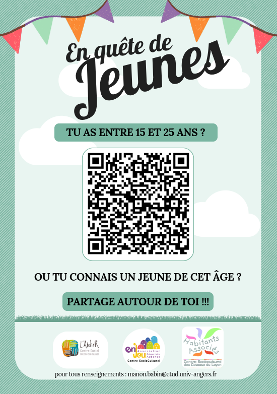 Dans le cadre d'une enquête sur les jeunes de 15 à 25 ans avec les trois centres sociaux présents sur le territoire Loire Layon Aubance, une enquête à destination des jeunes est en ligne.